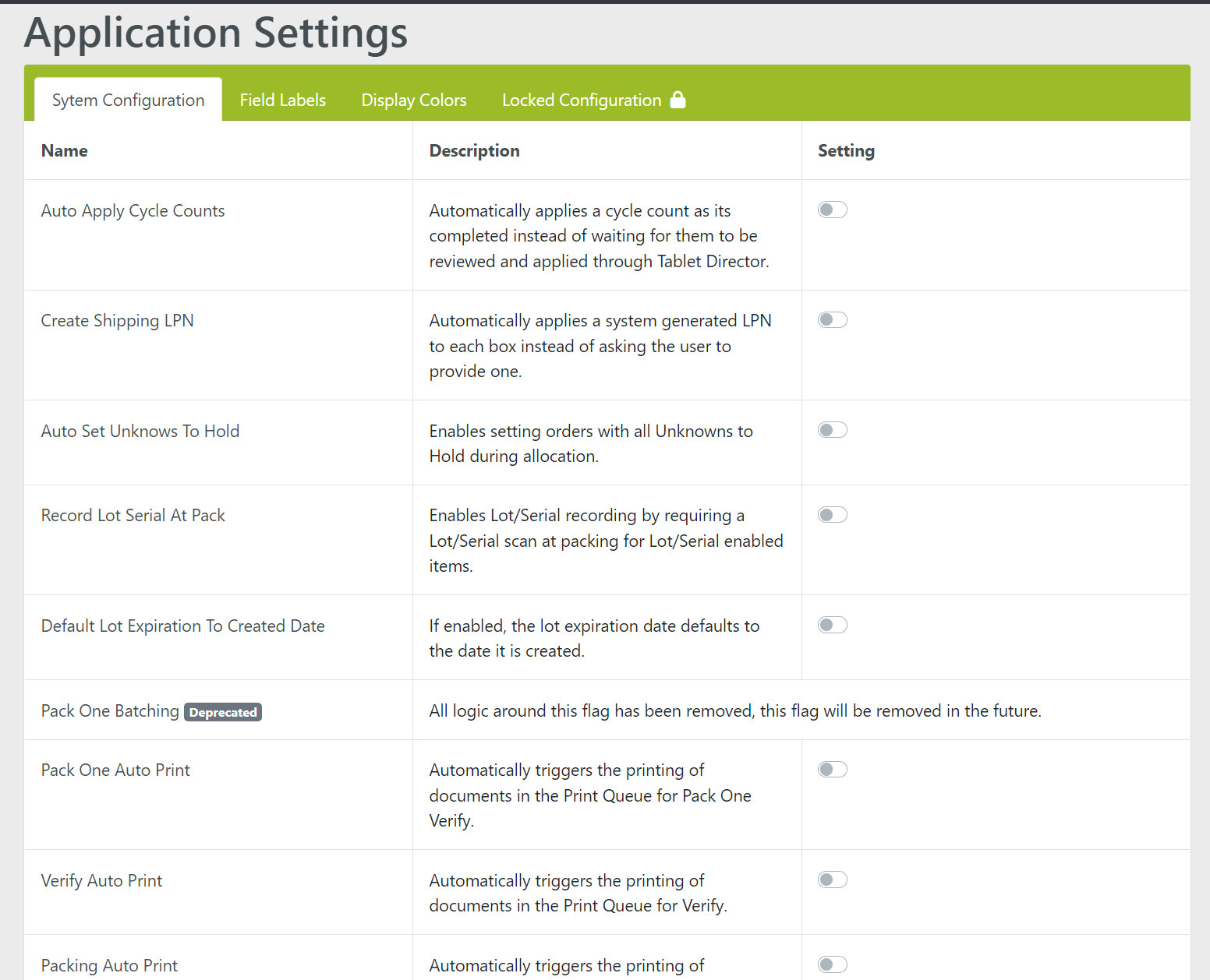 Configuration Settings in the Locked Configuration Tab are view only settings but can be configured by WarehouseOS support. To edit these settings, send an email to support@warehouseos.com for assistance.