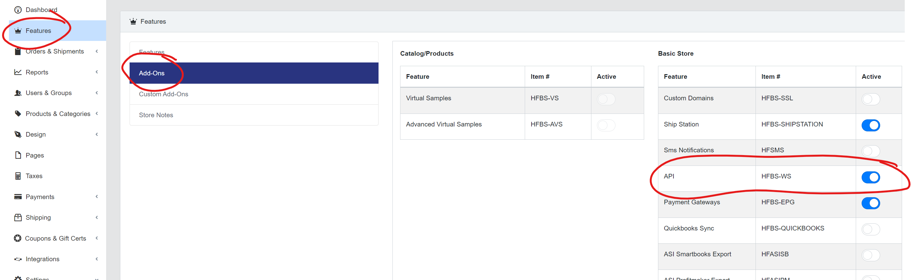 - Go to Features, open Add-Ons, and enable API under the Basic Store section.
