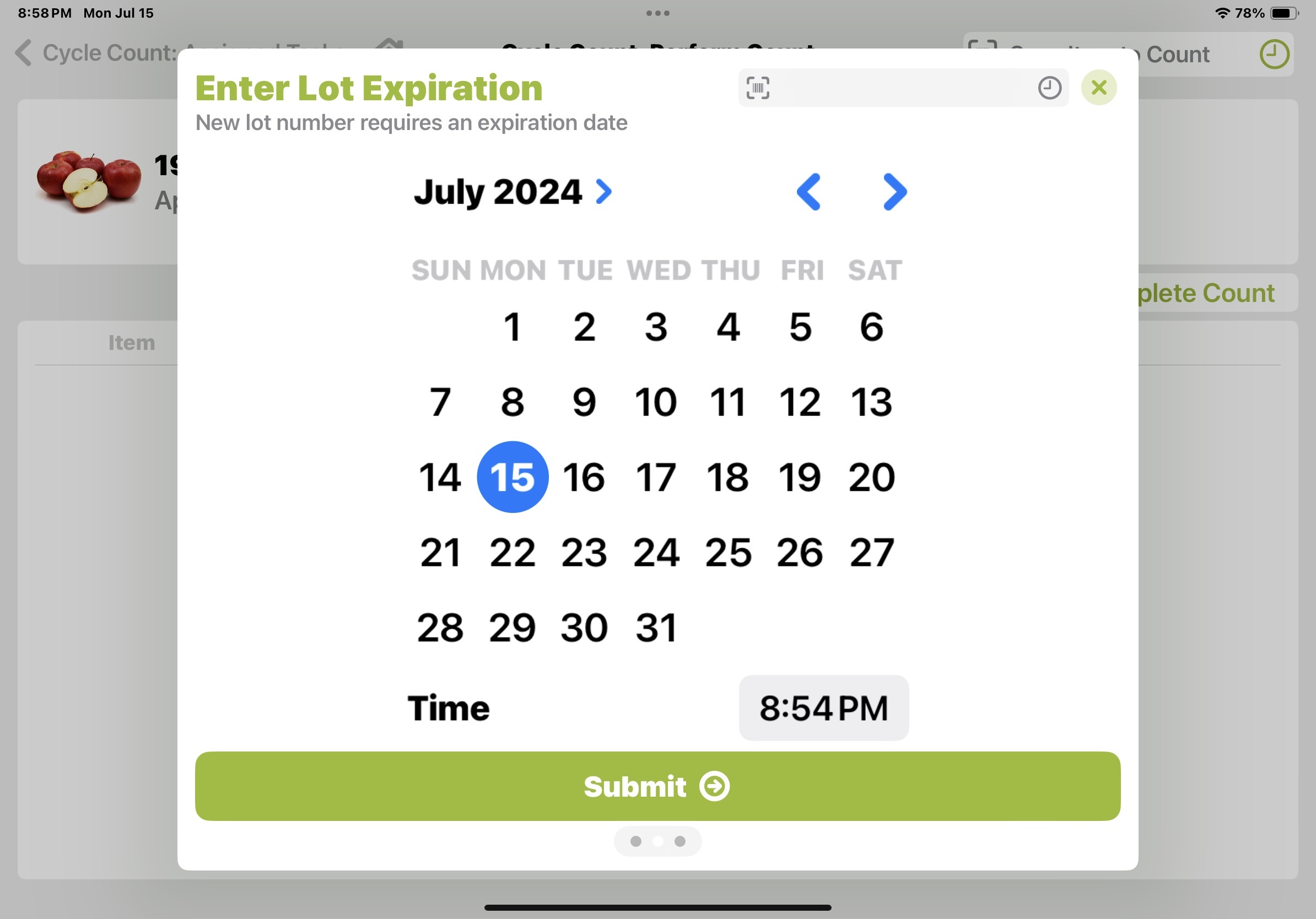 From here, a User can select a Lot Number from the List, Scan a Lot Number, or Enter a Lot Number. If a Lot for an Item requiring an expiration date is scanned/entered, and no expiration date exists in the system, an expiration date must be chosen.