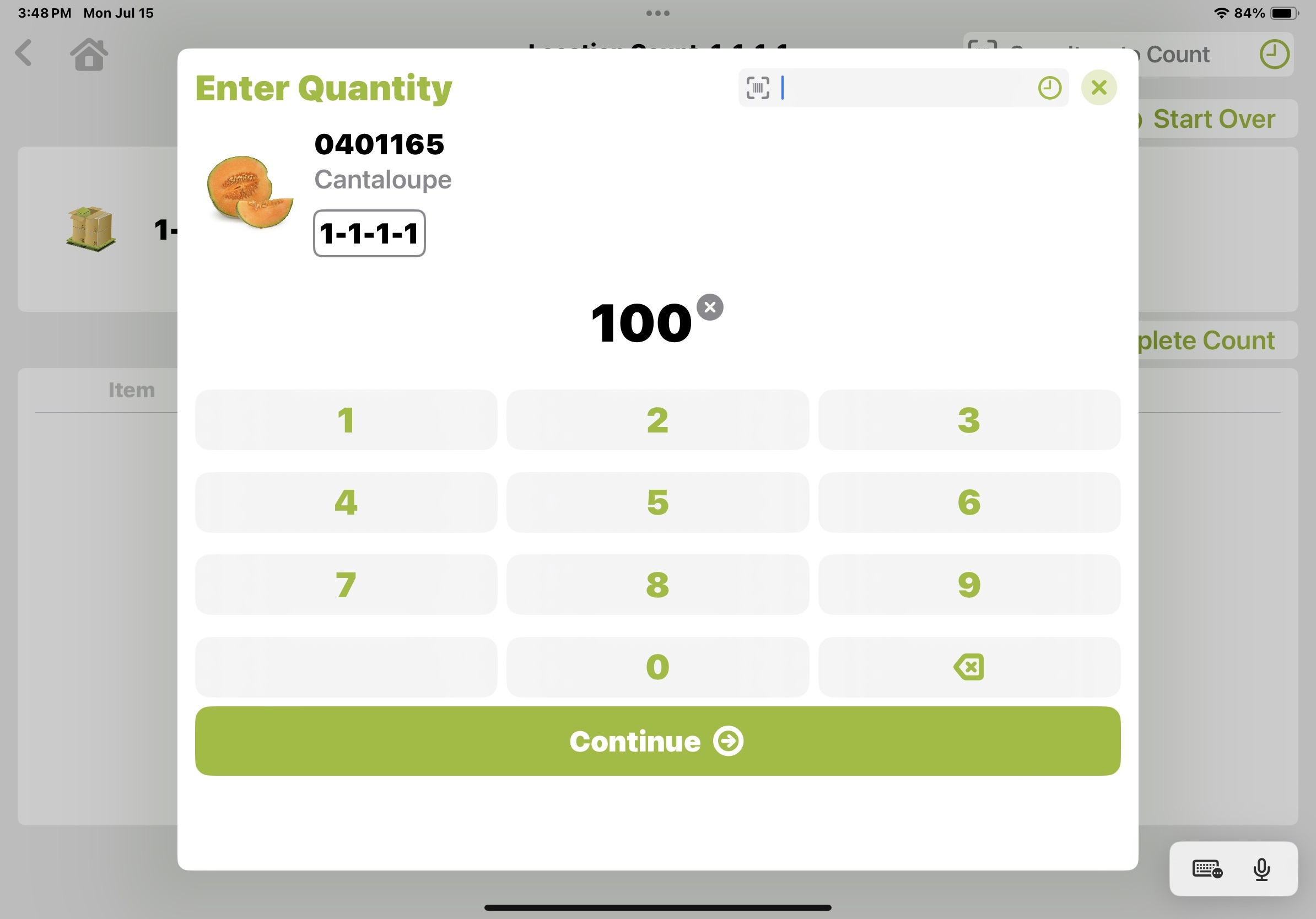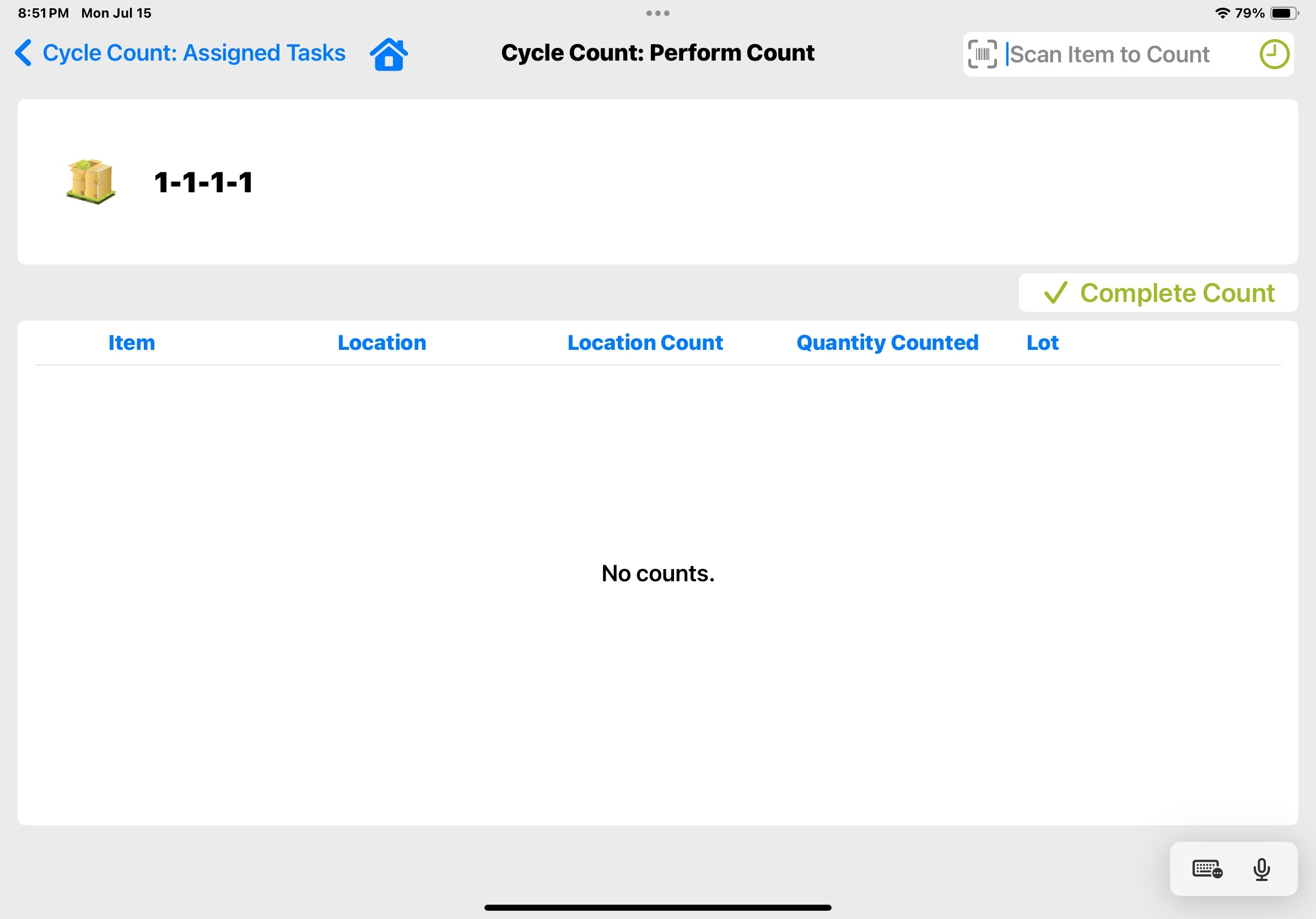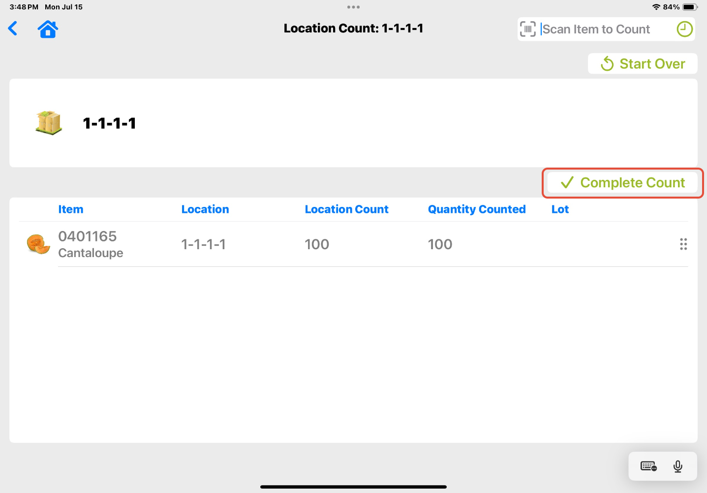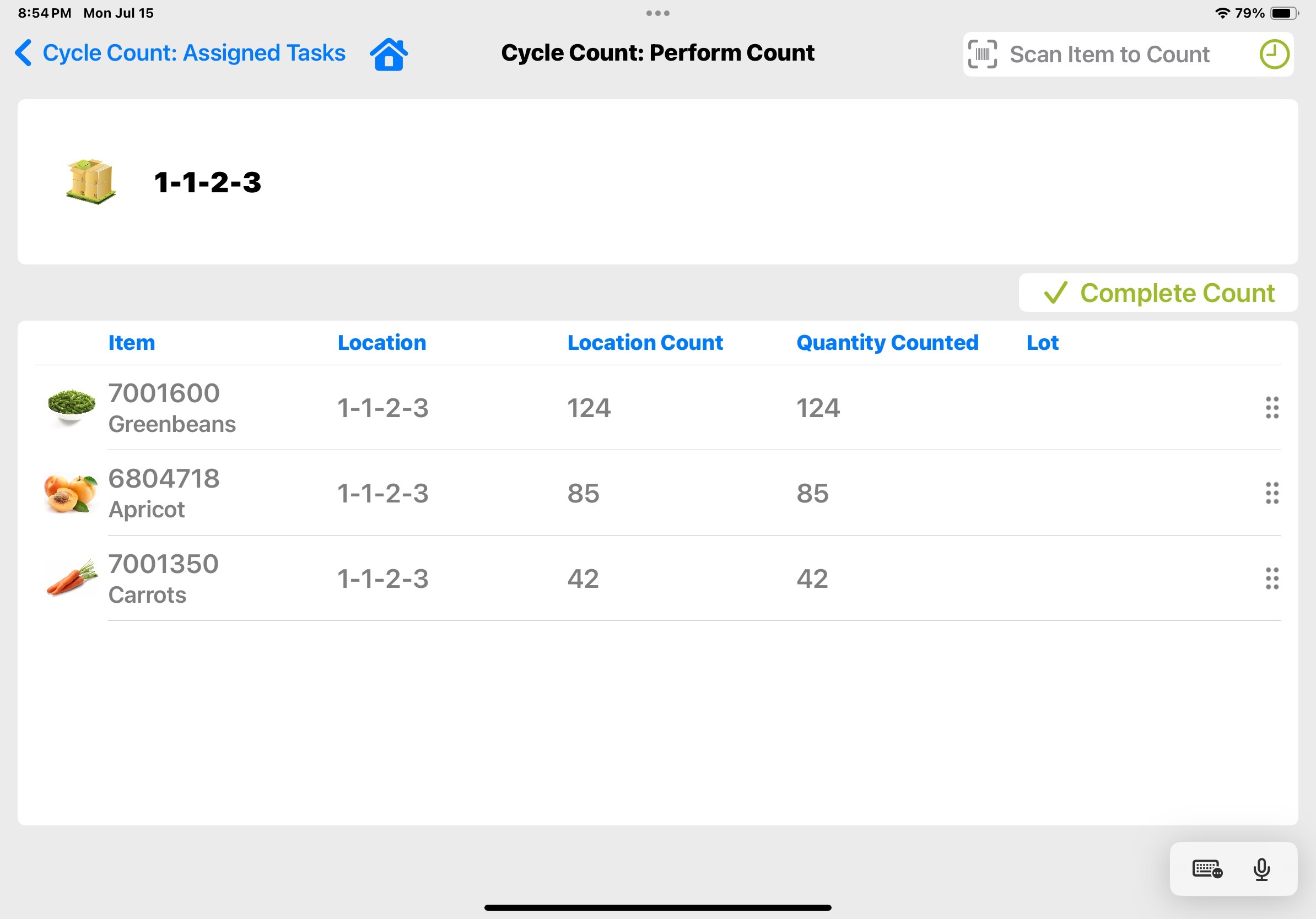 - Scan the Item to Count, enter the Quantity, then tap Complete.