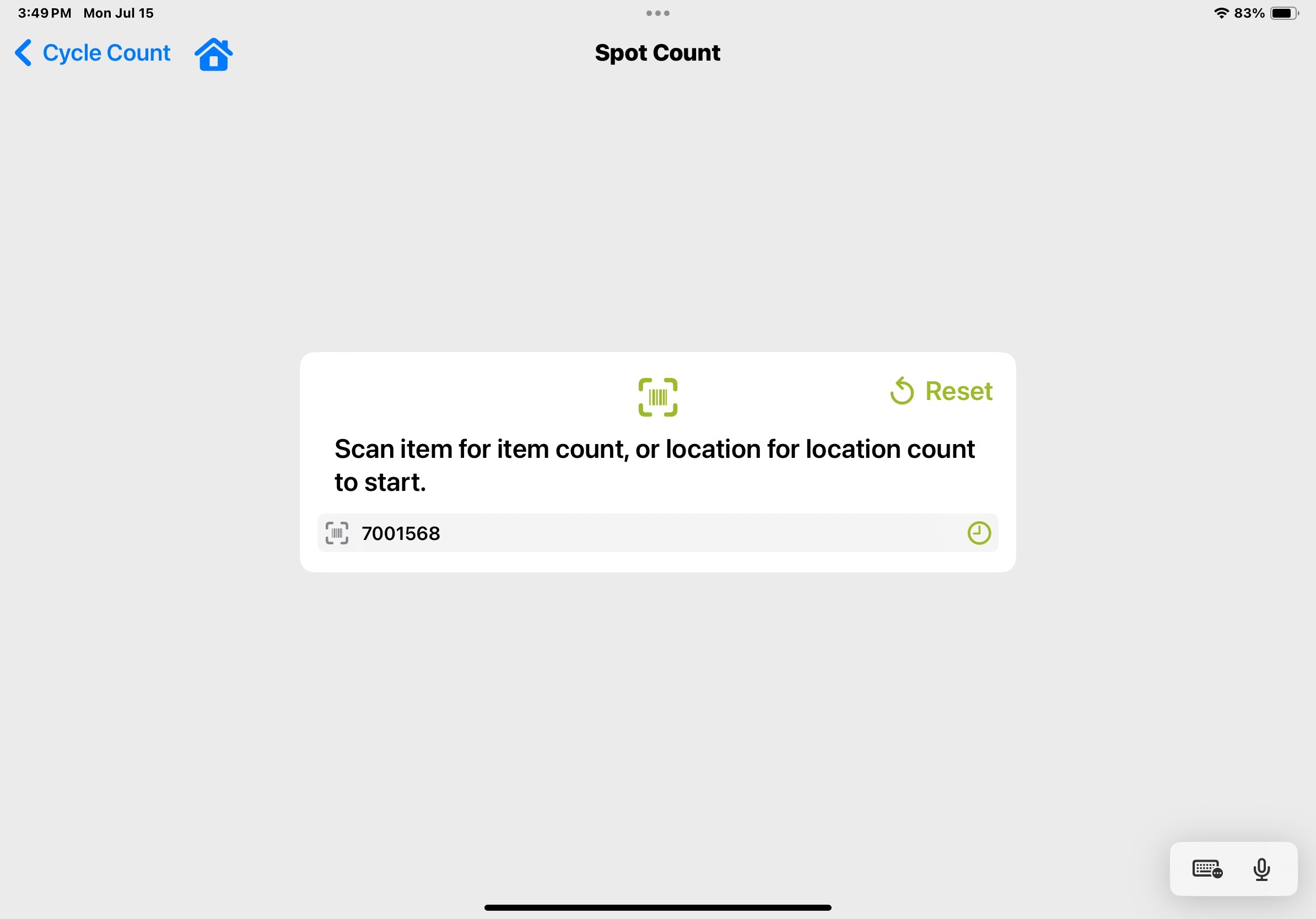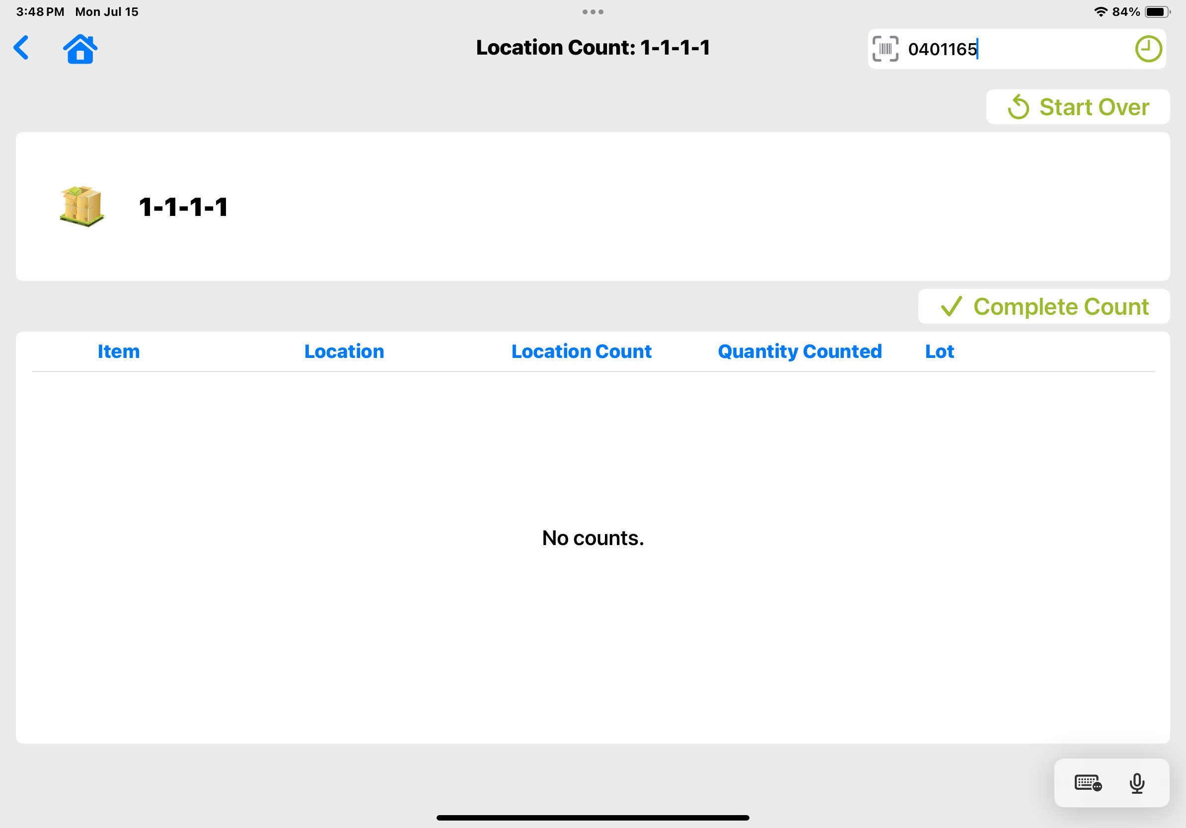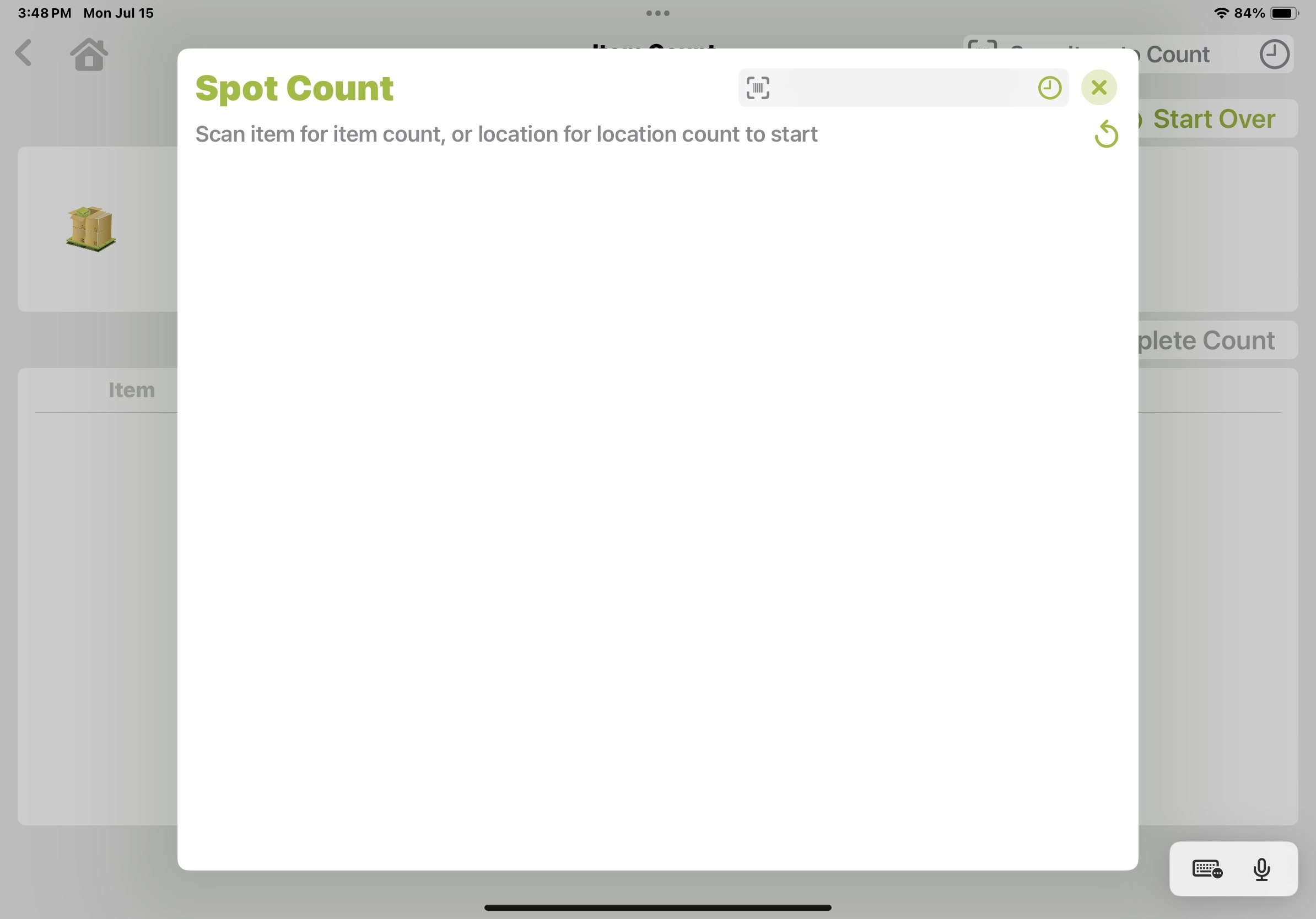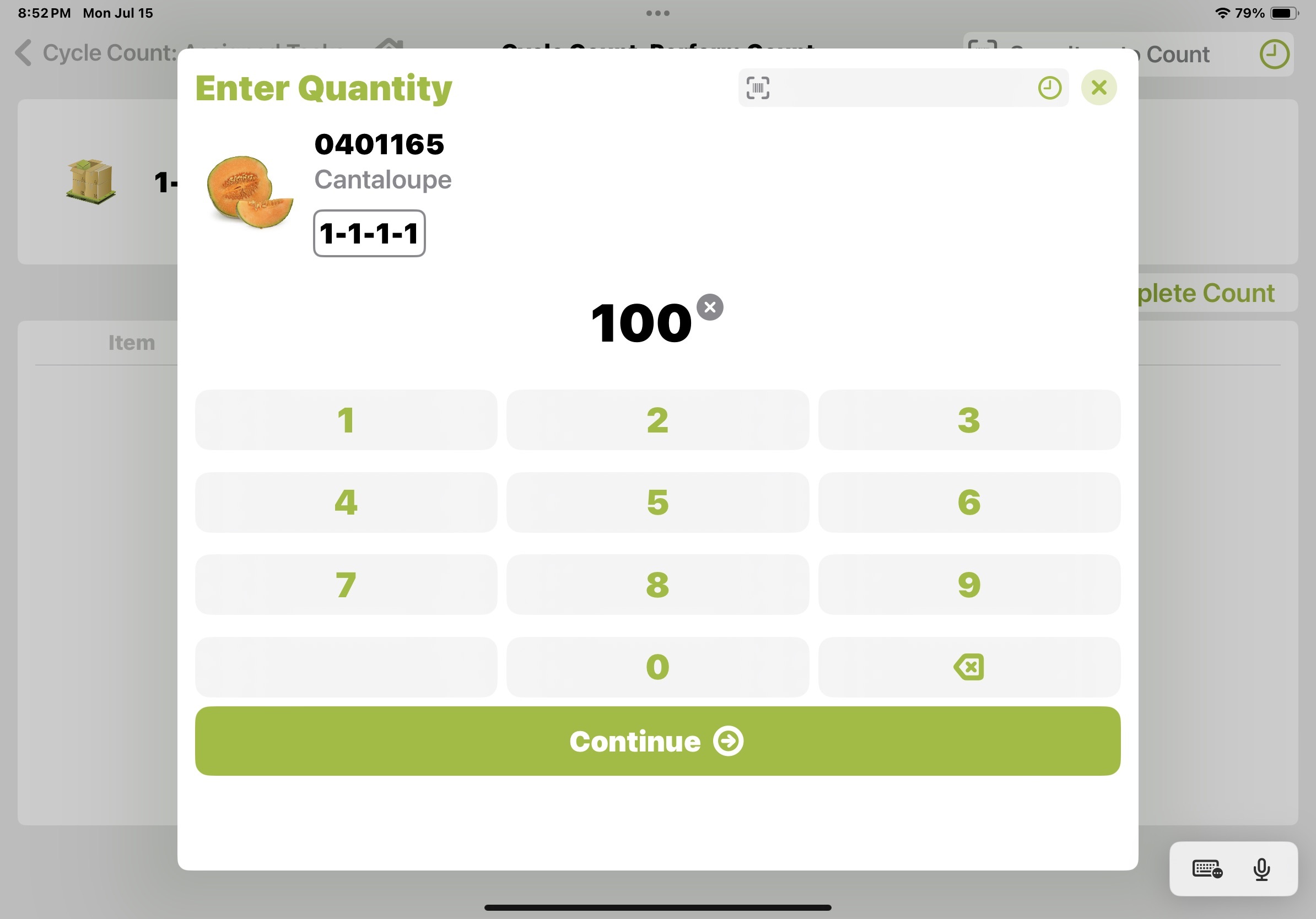 - Scan the Item to Count, enter the Quantity, then tap Complete.
