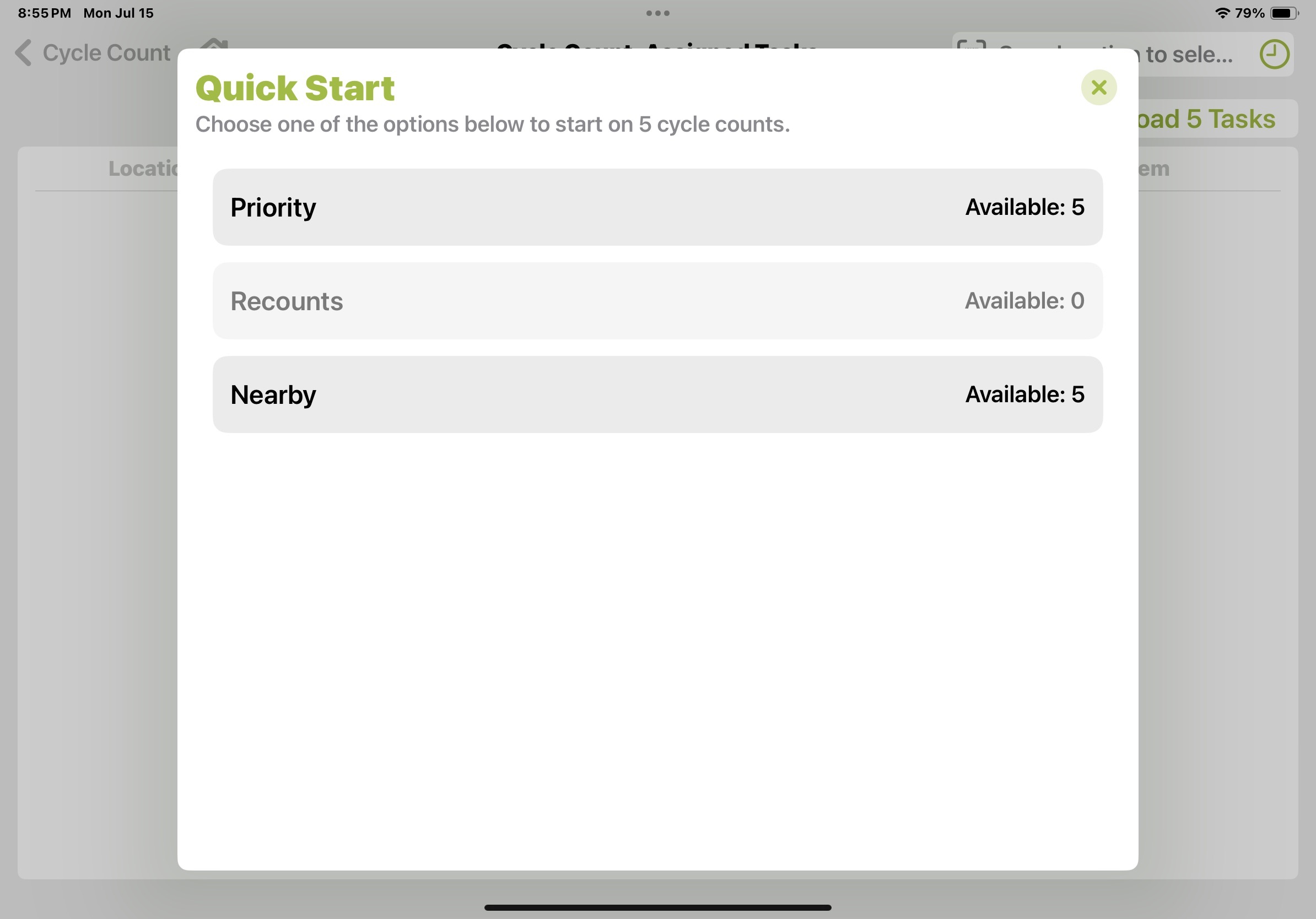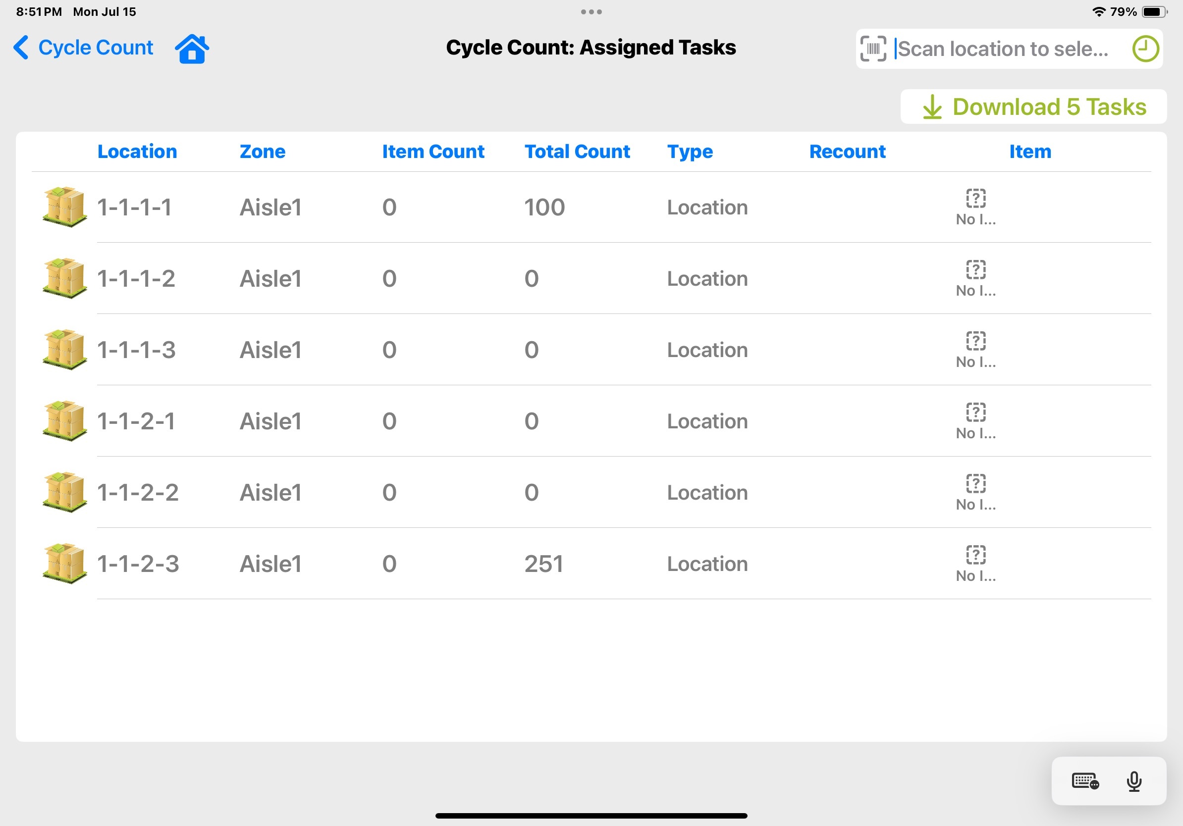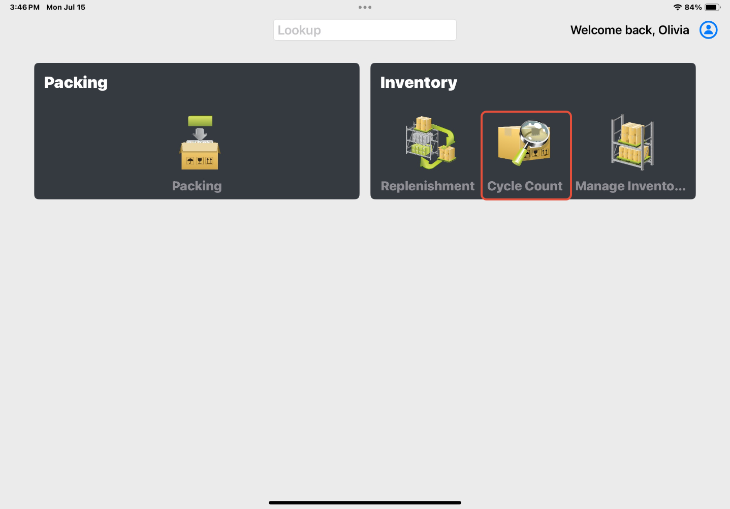 In WOS Fulfillment, under Inventory, tap Cycle Count
