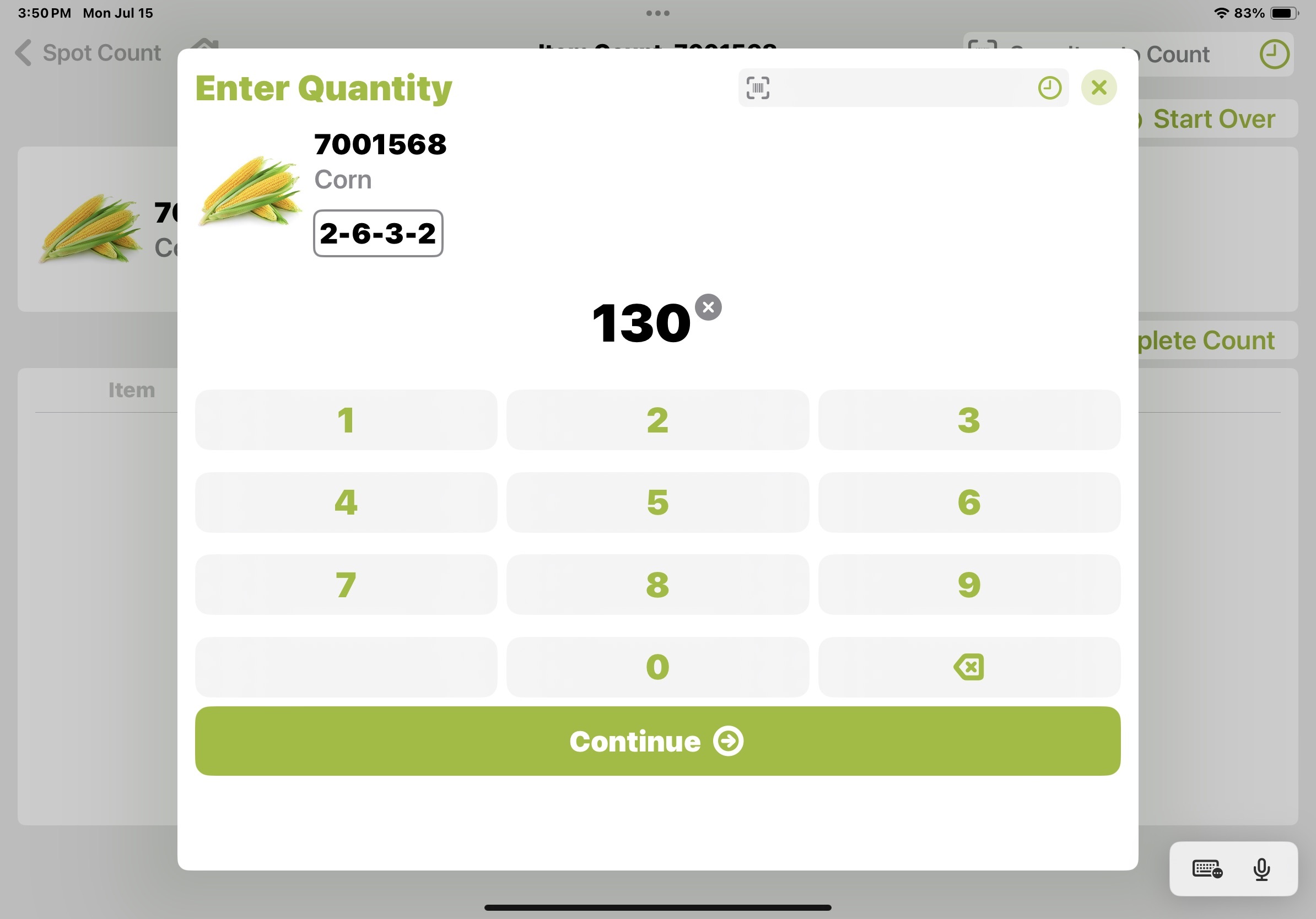 NOTE: Tapping Continue will add the quantity to the Counted screen. If the Item has already had a quantity entered for it, this new quantity will be added to the previous count, creating an aggregated count of the Item. This means that the same item can have multiple quantities entered.