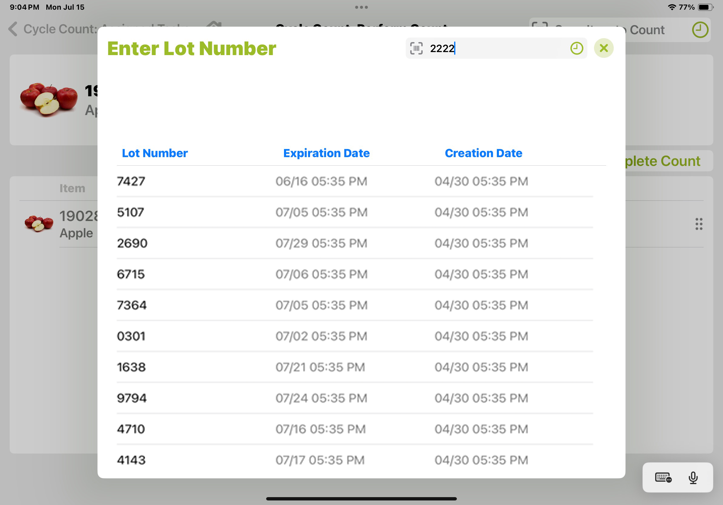 If an Item is set to require Lots to be recorded, after the Item is Scanned, an additional Lot Selection Screen will pop up.