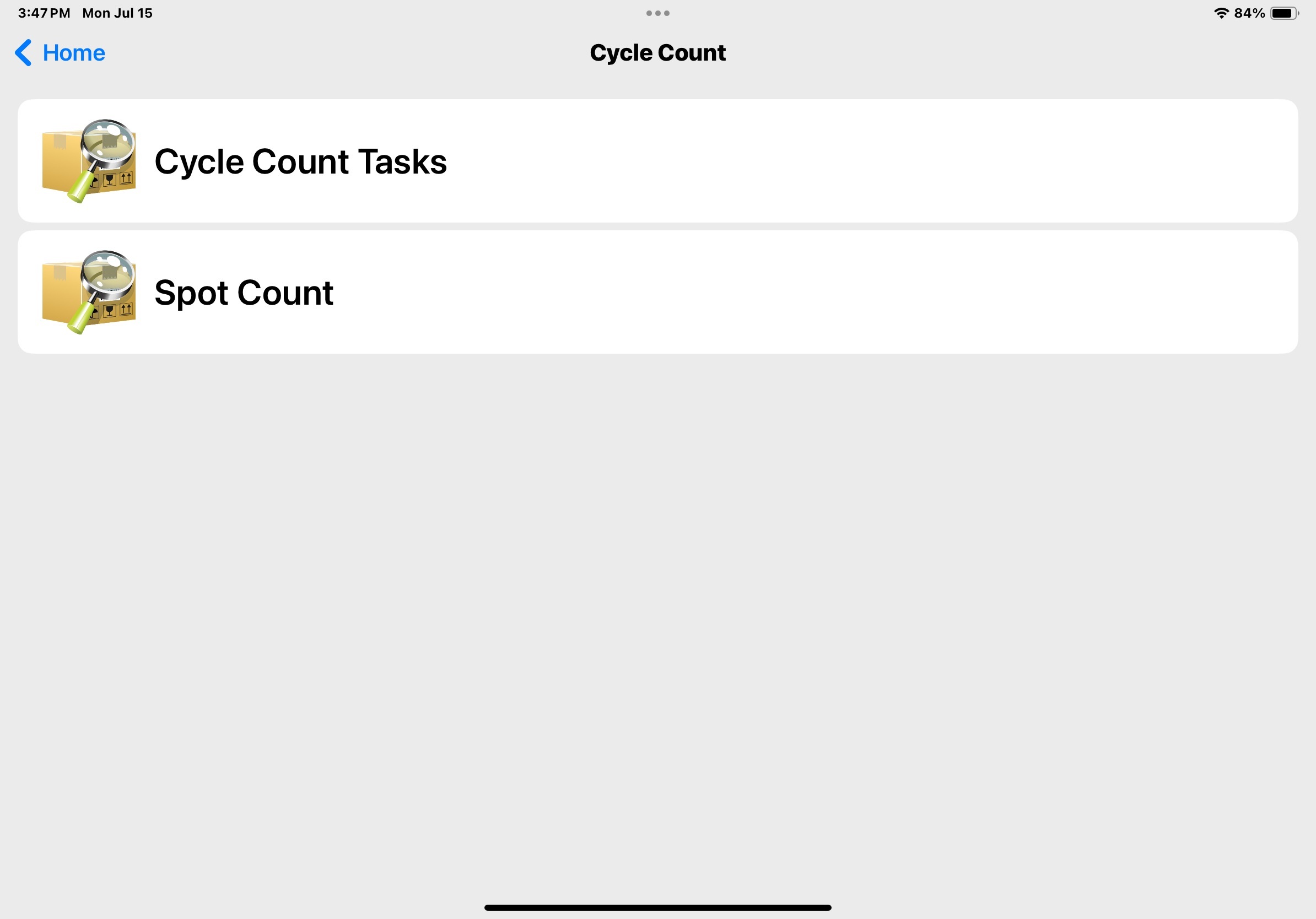 Choose to perform assigned Cycle Count Tasks or to perform a Spot Count.
