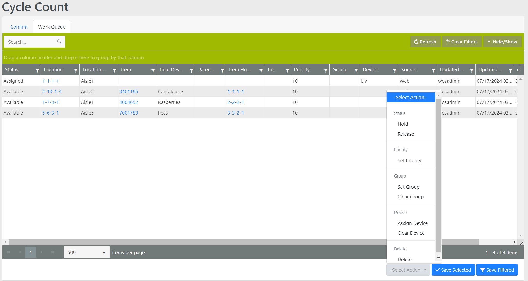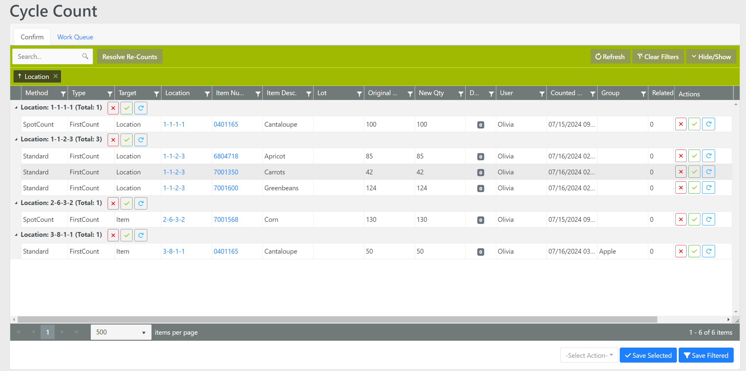 Cycle Counts can be confirmed Item by Item, by the whole Location, or multiple lines can be selected or filtered and then an Action can be chosen from the Action menu at the bottom of the screen to be applied to all selected/filtered.