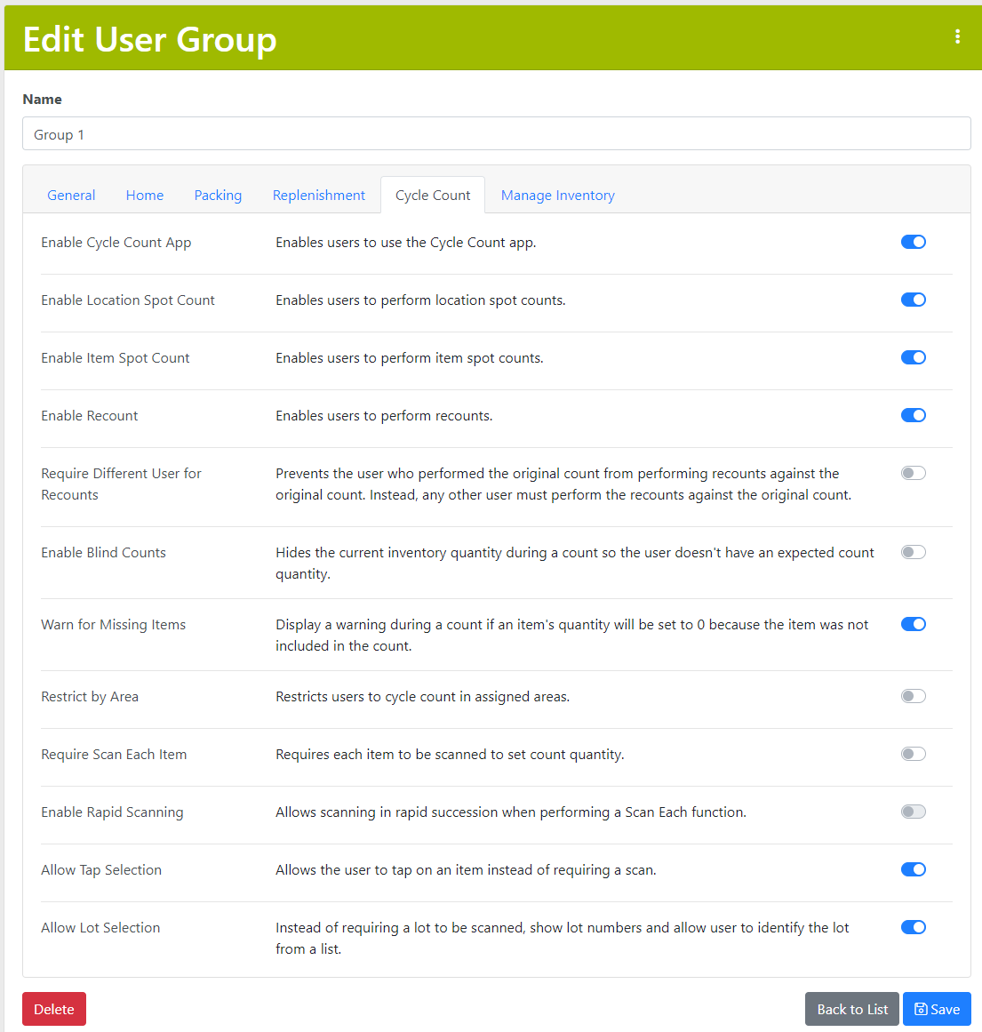 - Enable Cycle Count: Determines if the Cycle Count App is available for the Users in a particular Group