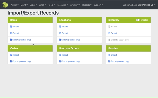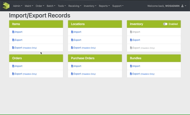The Import/Export Records functions are accessible under the Admin -> Import/Export Records menu option. This screen supports normal WOS Manager security features.