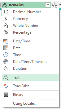 - From the ItemAlias column, click on 123 (Whole Number) and select ABC (Text).