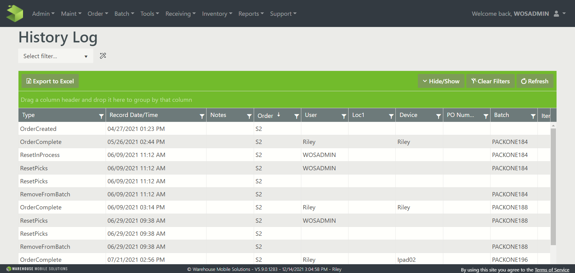 Note: History Log contains a large amount of data so filtering the data by Start/End Date and Time is important.