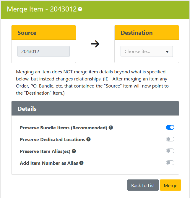 - By default, all Inventory, Orders, and Purchase Orders that related to the Source Item will be updated to now point to the Destination Item.