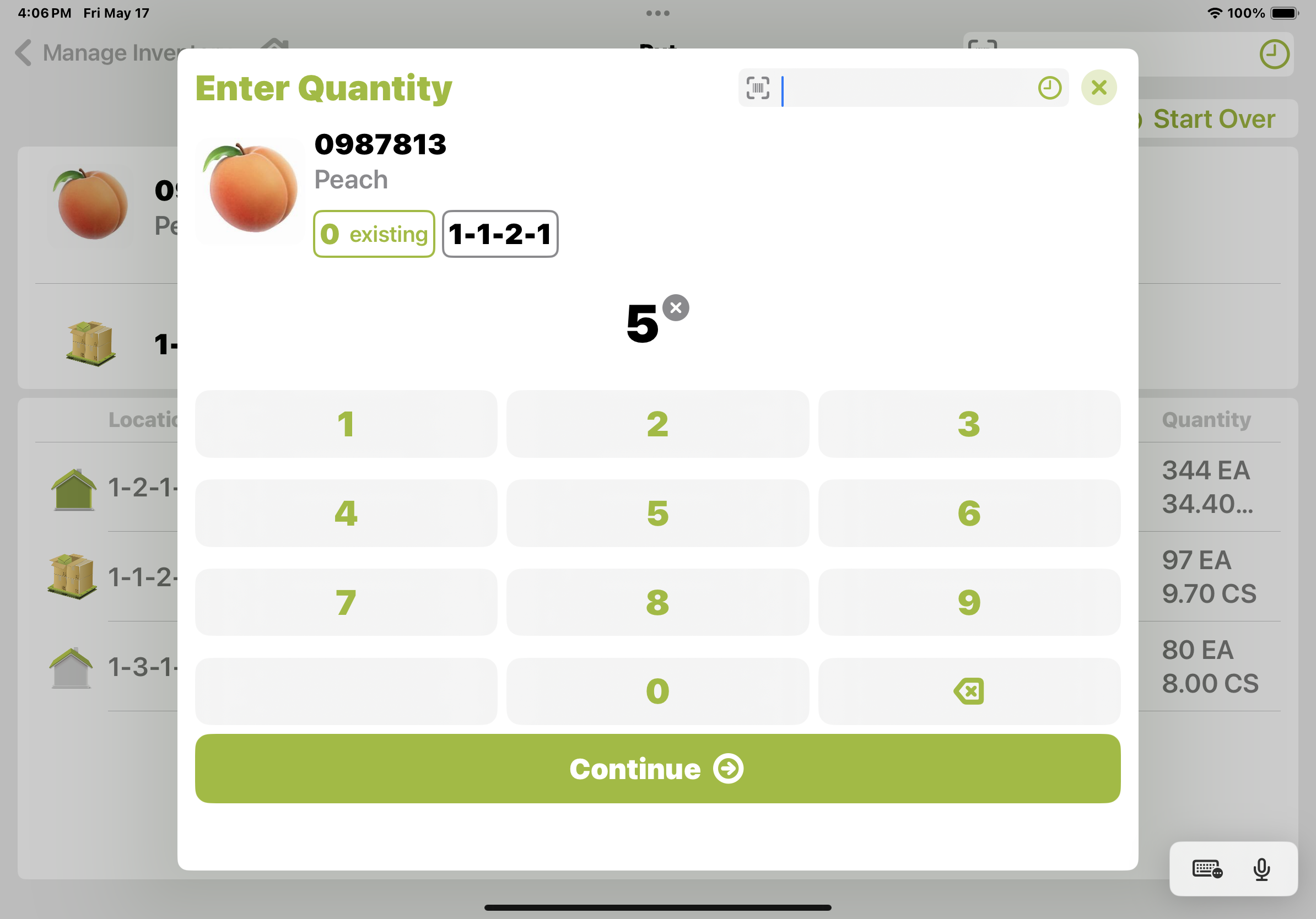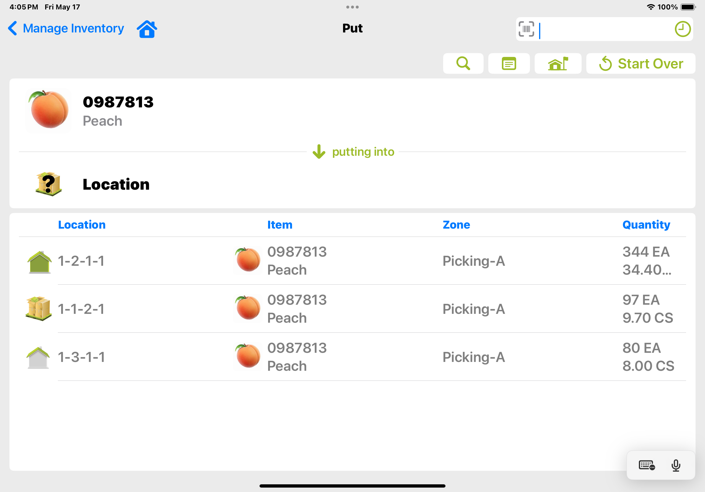 Scan/touch the Location to Put the product. Enter the quantity of product to Put and touch the <OK> button to complete the operation. Inventory is now created.