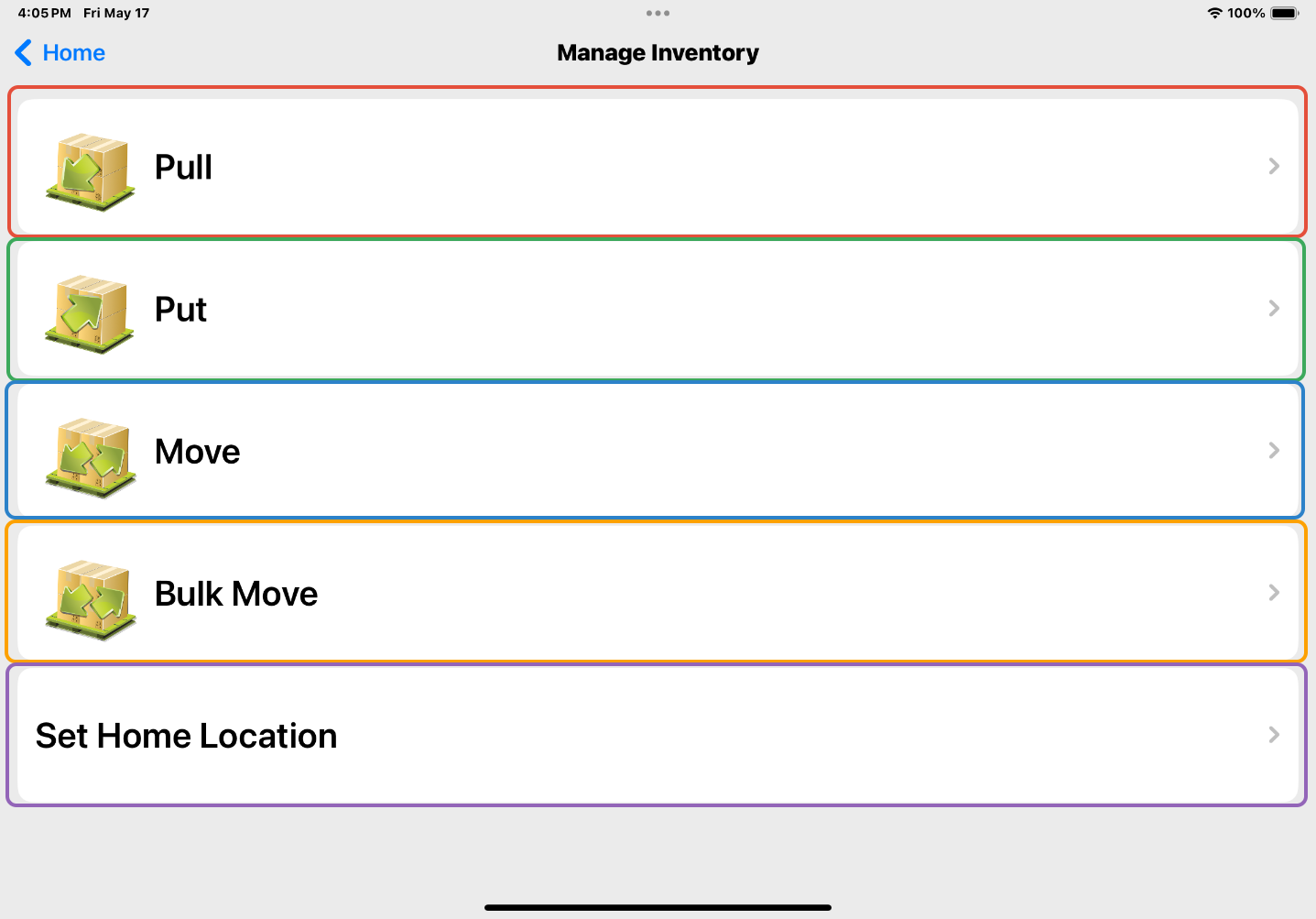 The Pull, Put, Move, and Bulk Move functions all have the same operational flow. To start any Manage Inventory operation, you must first scan either an Item or a Location.