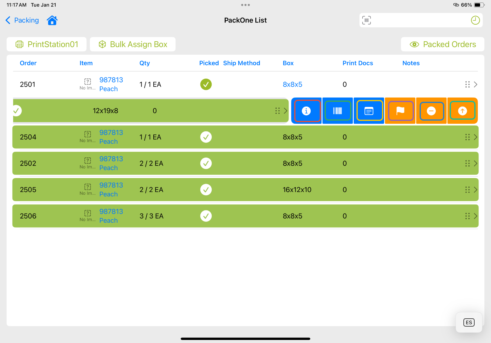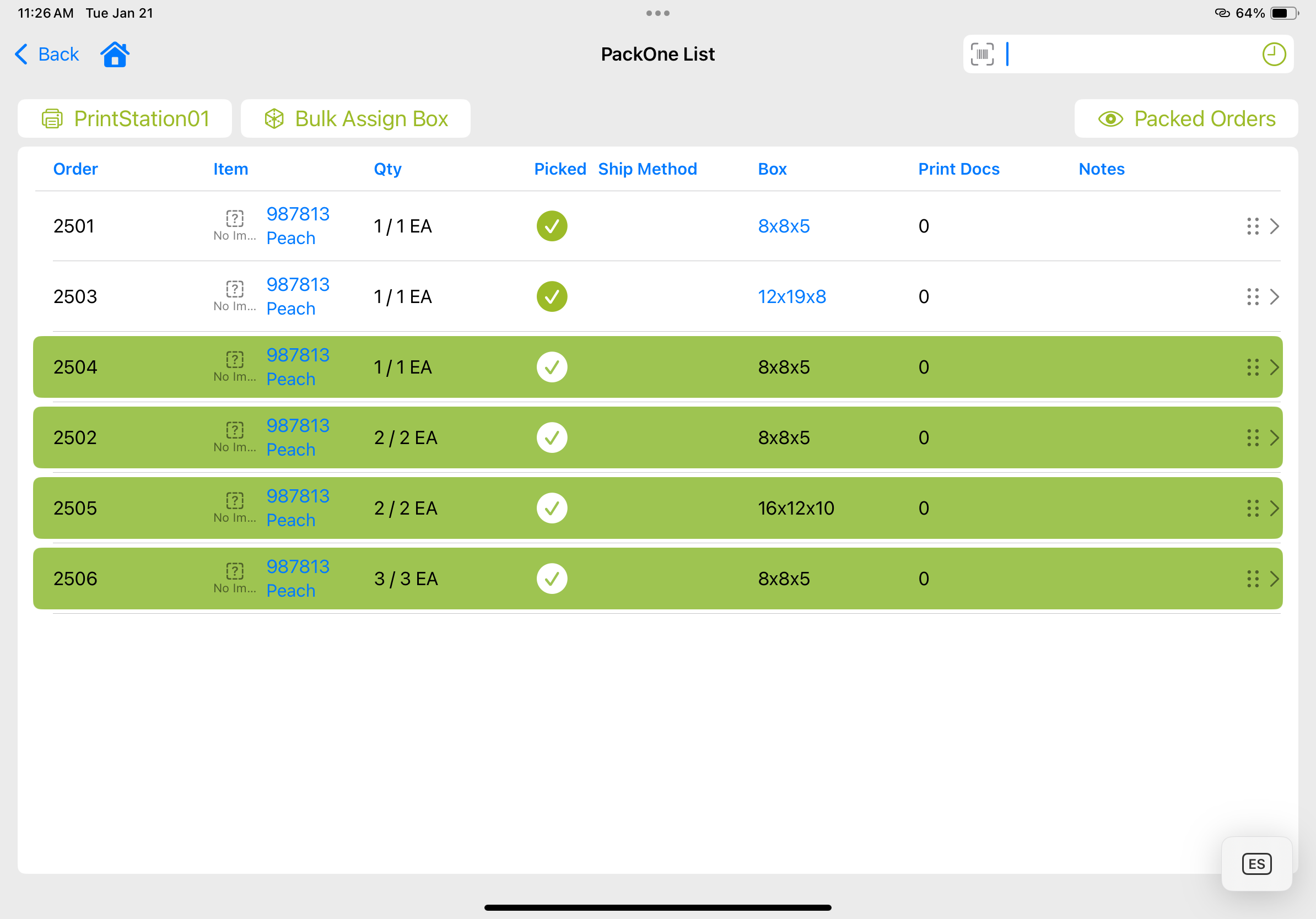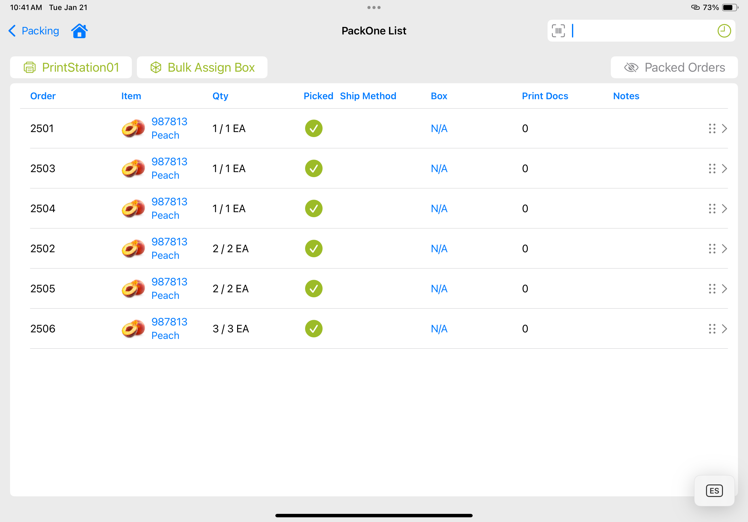 After selecting a Print Station, or if one has previously been selected on the Device, the Batch will populate on the screen with an overview of the Order Numbers, Item, Quantity, Pick Status, Ship Method, Box, Print Docs, and Order Notes.