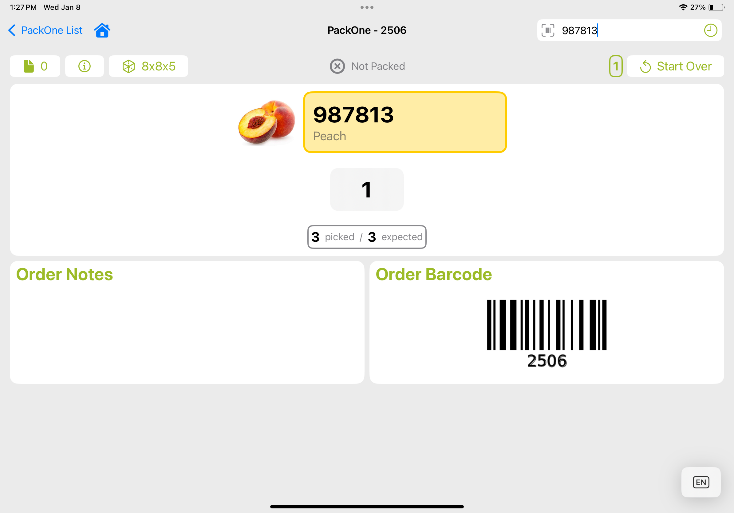 If an item is scanned off the cart, the system finds the first order in the list that has that item. Below the item scanned was a "Peach", which pulled up Order 2501. Order 2501 is a request for a Qty of 1. Since the quantity is met with a single scan, the order is immediately verified and shows highlighted green on the screen.
