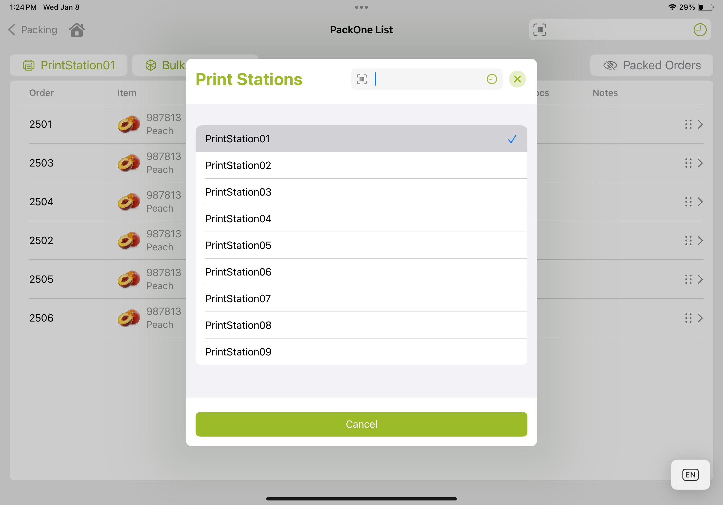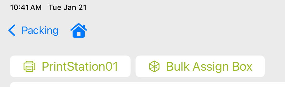 A Print Station must be selected to continue with PackOne if auto-printing is enabled. If a Print Station has not been selected for the Device, the User will be prompted to select one to use. If the Print Station needs to be changed after selection with the pop up, this can be done by tapping on the printer icon at the top left of the screen.