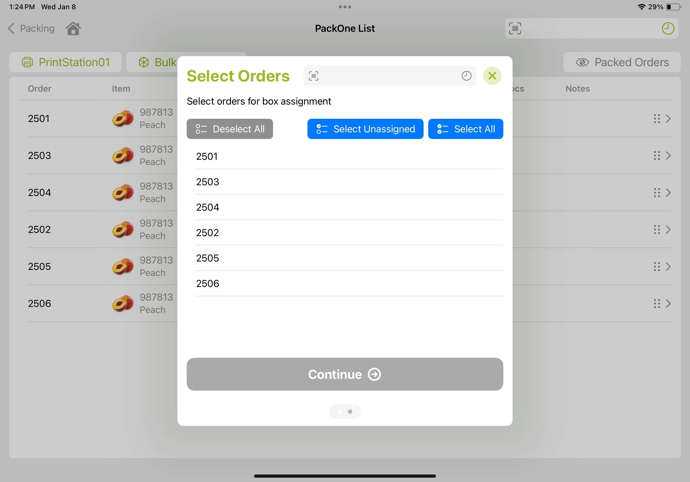 Here they can select which Orders they want to assign a Box Type for. These orders can be specifically selected, or the User can tap on the Select All or Select Unassigned buttons.