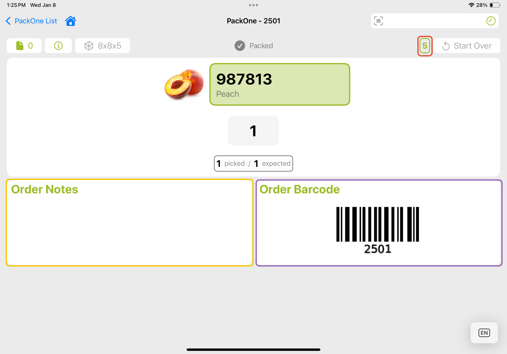 At the top right of the screen is a number that represents the amount of orders left on the batch waiting to be packed. In this example, there were 6 orders left in the batch until order 2501 was scanned and packed, now there are only 5 orders remaining. When that number reaches 0, the batch has been completely packed.
