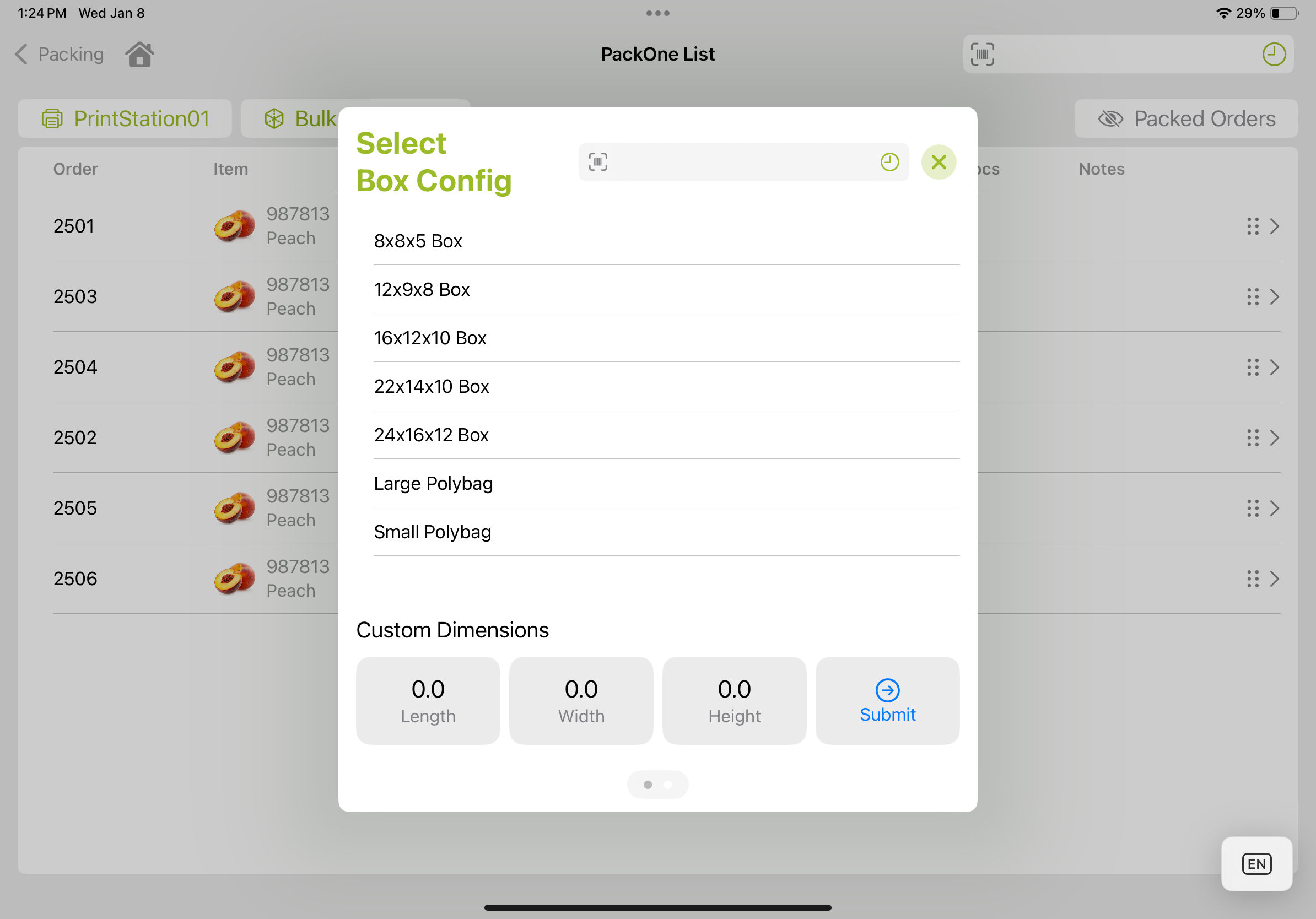 Once the orders have been selected, the User can choose a pre-set Box Type or enter Custom Dimensions.