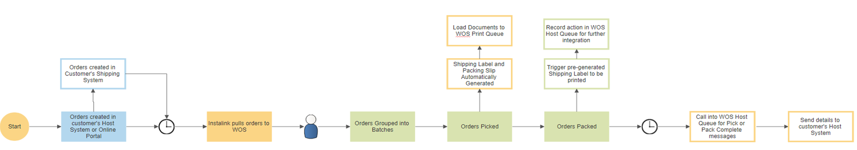 Another variation is that it's possible for the shipping system to require a second call to mark the order completed after the label is created. This allows WOS to send a message after packing and trigger the flow back up to the Host system.