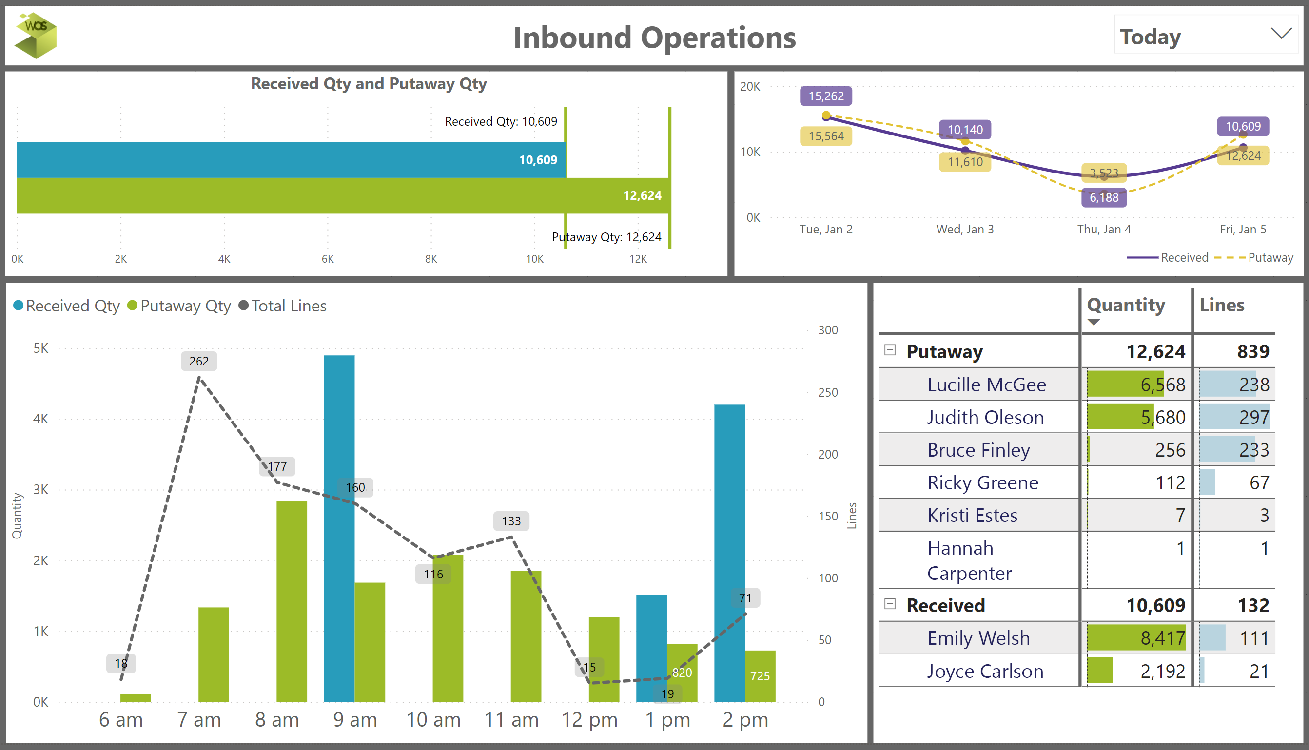 • Hourly progress, daily values, and user metrics are provided for both Receiving and Putaway operations