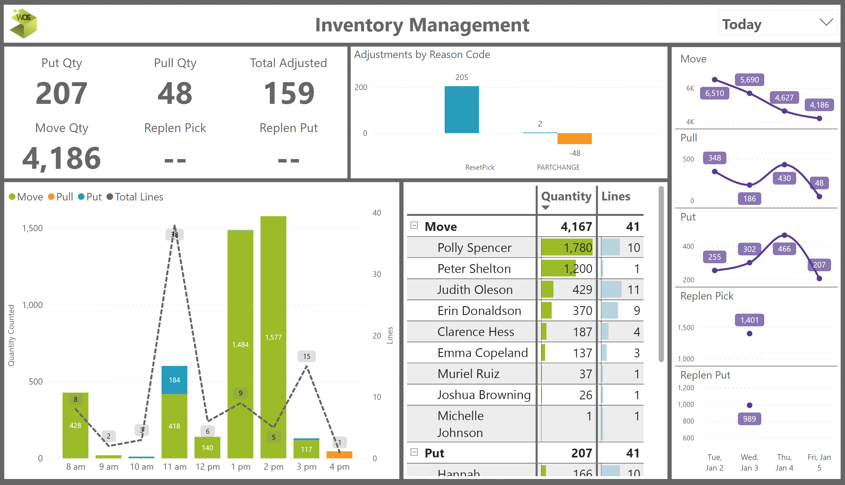 • Hourly transactions, daily values, and user metrics are provided for all inventory movement and adjustment transactions