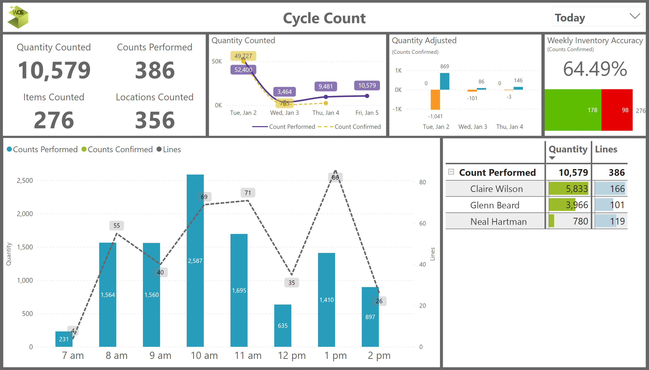 • Hourly counts, daily values, and user metrics are provided for cycle counts performed and confirmed