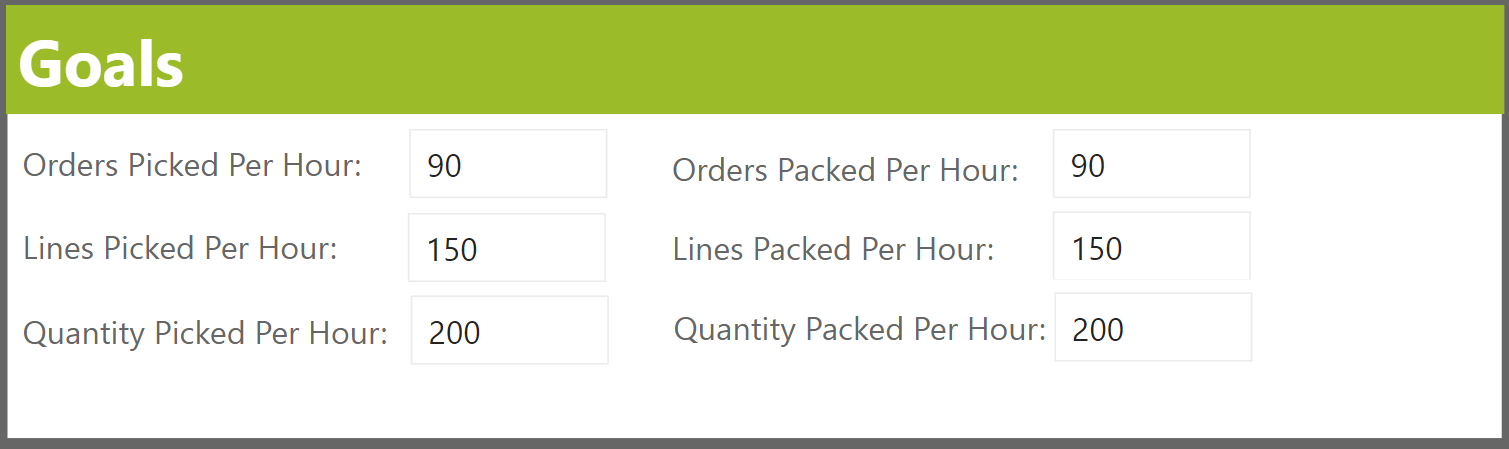 • The Outbound and Pick and Pack Performance pages provide the ability to show progress towards a goal.  These goals can be set from the Home page.