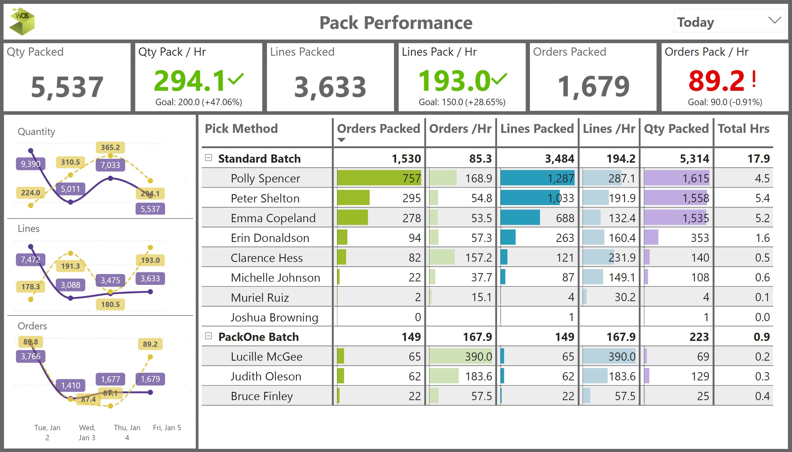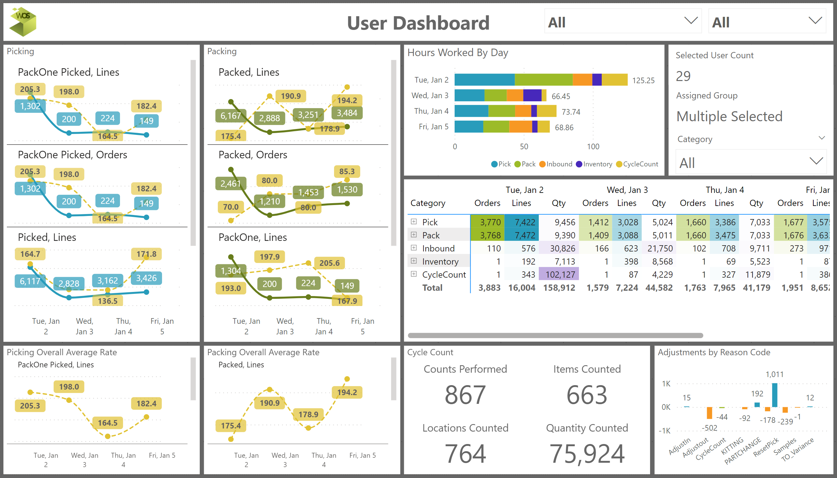 • Two separate pages focus on the picking and packing operations including overall and user specific metrics